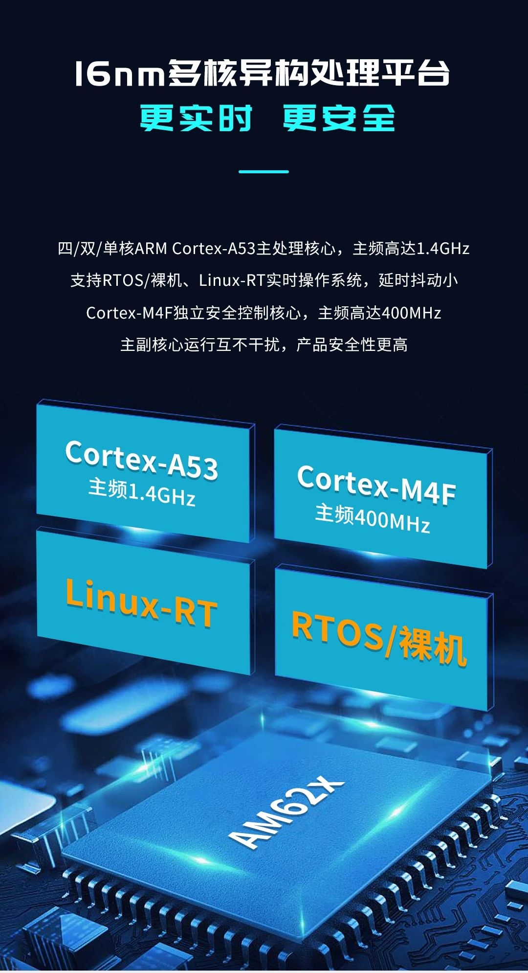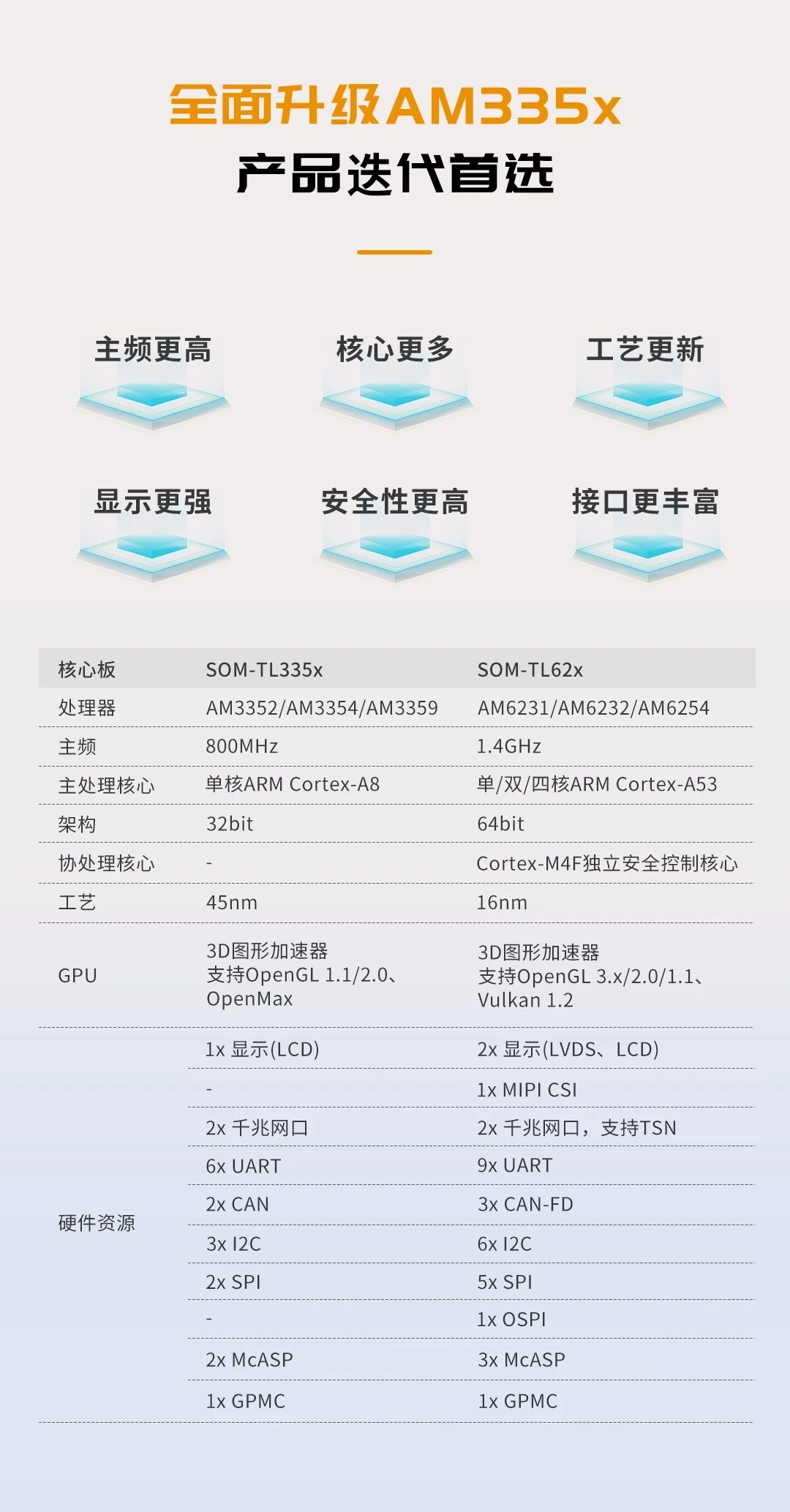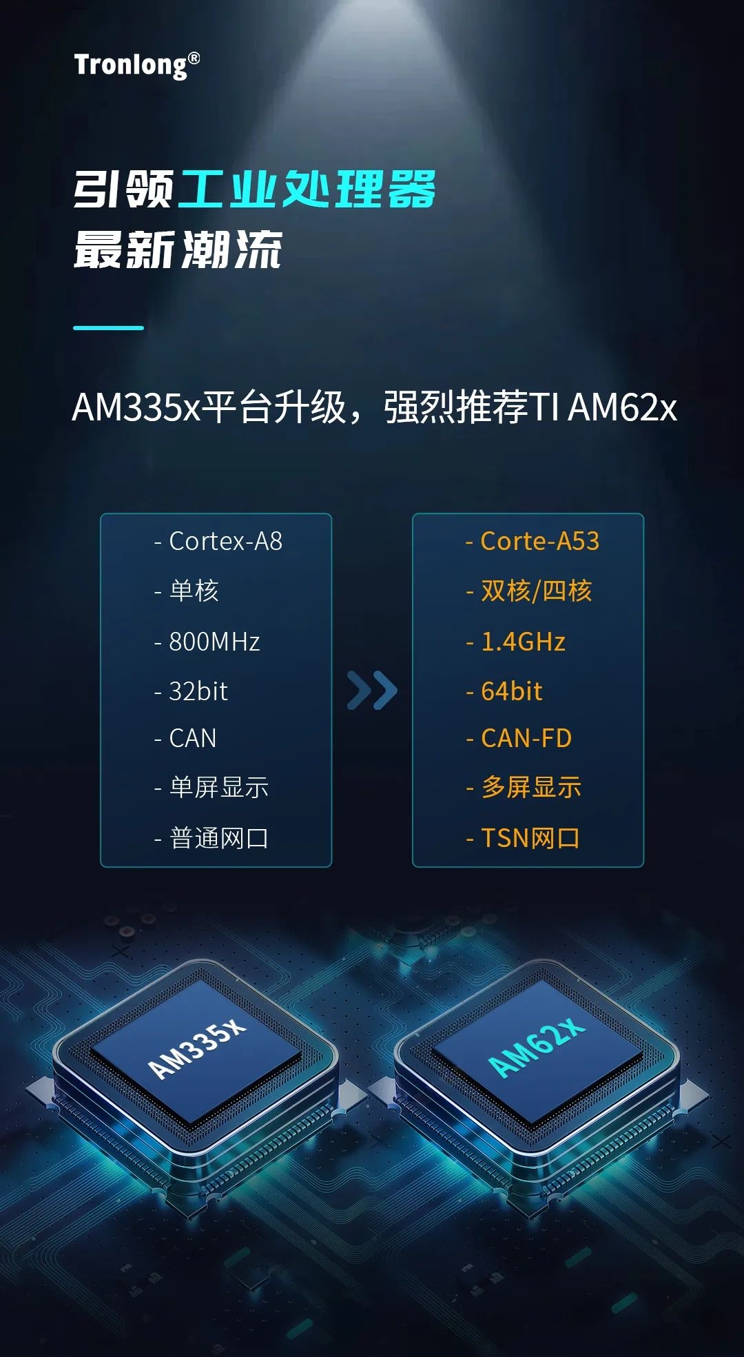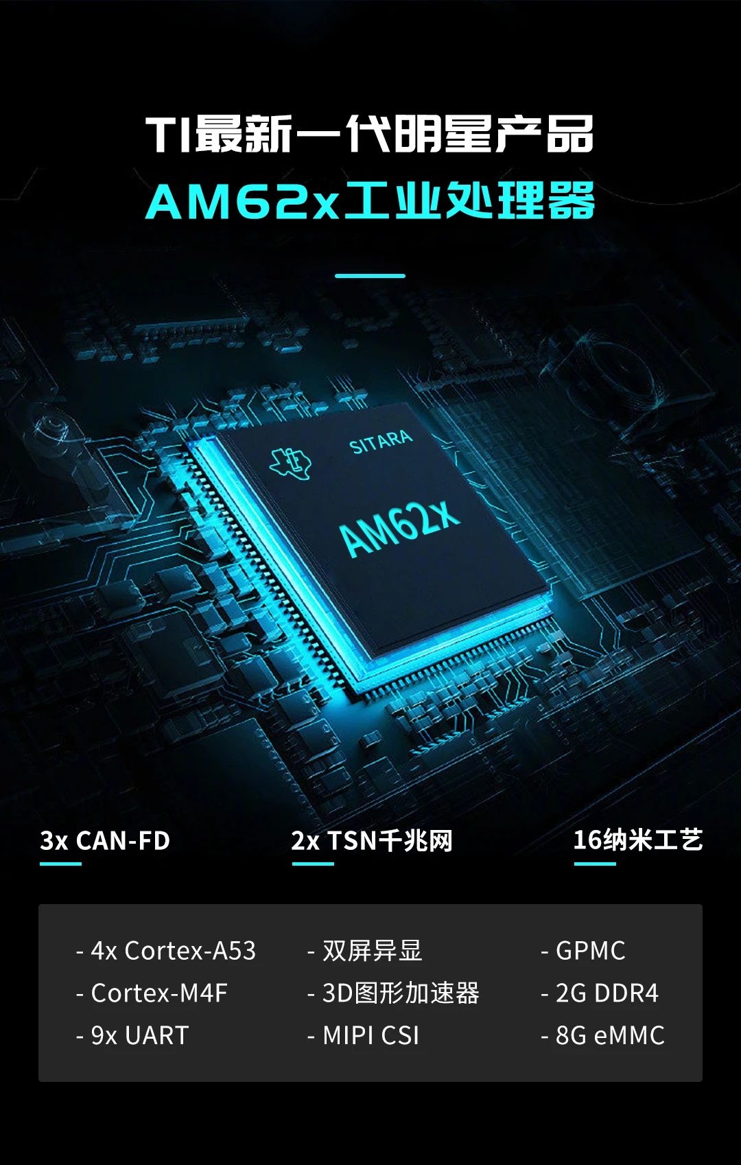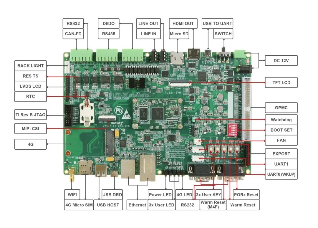 AM62x是TI四核Cortex-A53@1.4GHz + Cortex-M4F@400MHz異構多核處理器,算力高達16800DMIPS,支持LCD + LVDS雙屏異顯,同時支持3x CAN-FD、4x SPI、9x UART、2x TSN千兆網口等外設接入,作為TI經典之作AM335x的全新升級平臺,較好滿足滿足當前工業潮流下的多樣新興需求。