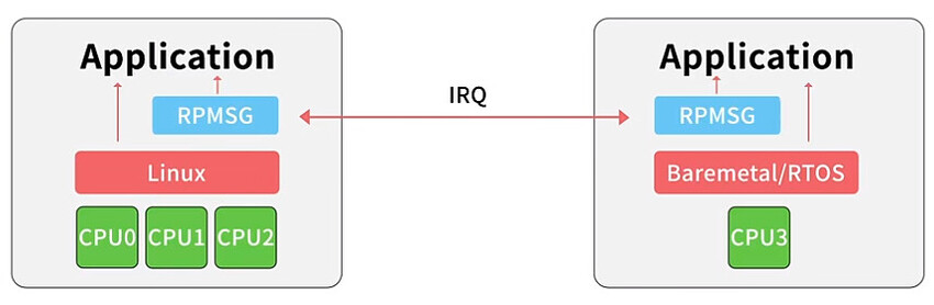 AMP(Asymmetric Multi-Processing),即非對稱多處理架構。“非對稱AMP”雙系統是指多個核心相對獨立運行不同的操作系統或裸機應用程序,如Linux + RTOS/裸機,但需一個主核心來控制整個系統以及其它從核心。每個處理器核心相互隔離,擁有屬于自己的內存,既可各自獨立運行不同的任務,又可多個核心之間進行核間通信。