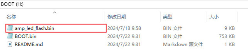 首先,請將Linux系統啟動卡通過讀卡器插至PC機USB端口,并將案例的amp_led_flash.bin文件拷貝至Linux系統啟動卡BOOT分區(FAT32格式)。