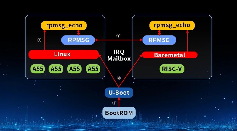 ARM(Linux) + RISC-V(Baremetal)方案該方案巧妙結合了ARM架構的高性能與RISC-V的靈活性,為各類應用提供了強大的平臺支持。ARM核心運行Linux操作系統,作為主核承擔整個多核異構系統中共享資源的劃分和管理的工作,而RISC-V核心作為從核則運行Baremetal程序,專注于實時或專用任務的處理。這種分工協作模式,使得ARM端能夠高效處理復雜的計算任務和系統管理,同時利用RISC-V端的靈活設計,滿足特定場景下對硬件資源的定制化需求。通過優化資源分配,該方案有效降低了硬件成本,為電力繼電保護裝置、工業自動化等場景提供了高效且經濟的解決方案。