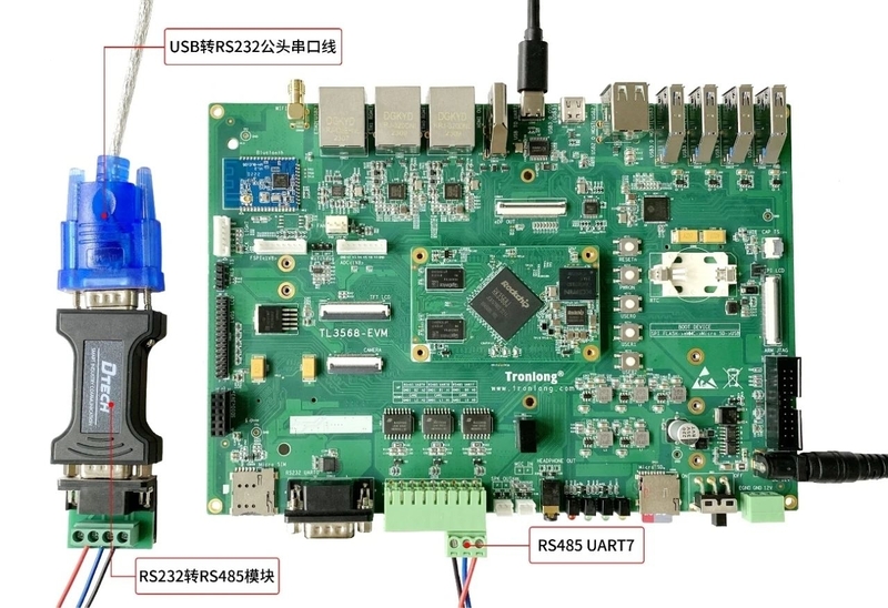 首先,我們使用Type-C線將評估板USB TO UART2串口連接至PC機,使用RS232轉RS485模塊、USB轉RS232公頭串口線將評估板RS485 UART7串口連接至PC機,如下圖所示。