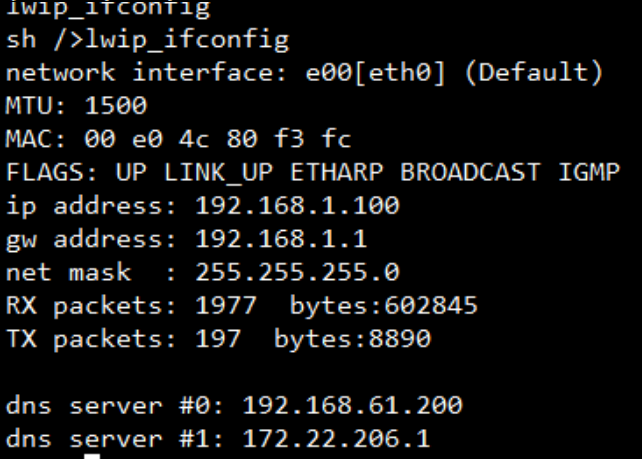 進入OneOS系統后,在串口工具輸入lwip_ifconfig獲取評估板IP。